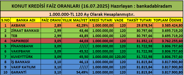 16/07/2025 Tarihli Konut Kredisi Faiz Oranları
