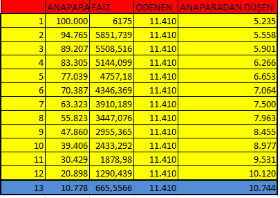 Ek hesabı sanki kredi öder gibi ödediğimiz çizelgeyi alta ekliyorum. 13. ayı ödedikten sonra bitmiş oluyor.