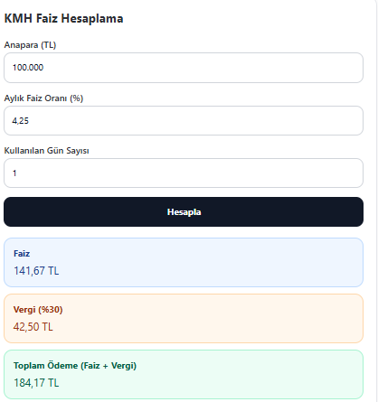 Diyelim 1 günlük, 100.000 TL kullandınız. KMH faizleri de şu an %4,25.