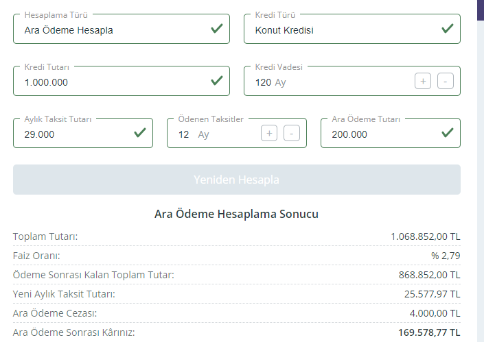 Yaptığınız anapara ödemesinin %2 si kadar ceza ödersiniz. Örneğimizde 200.000-TL ara ödeme yapmıştık. Dolayısıyla 4.000-TL ceza ödedik. Yani aslında 200.000-TL değil 196.000-TL kredimiz için ödeme yapmış olduk.