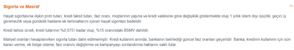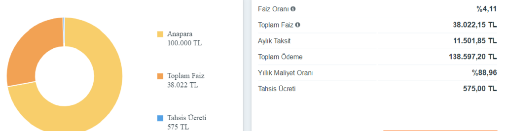Yukarıdaki resimde 100.000-TL nin %4,11 faiz oranıyla 12 vadeli yıllık maliyet oranını görüyorsunuz. Ancak bu yıllık maliyet oranına hayat sigortası dahil edilmemiş. Normalde siz hesaplarken ya da iki bankayı kıyaslarken bunu da dahil etmelisiniz.